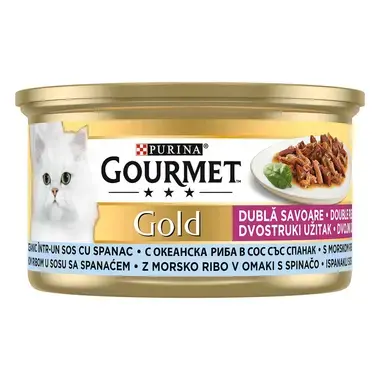 GOURMET™ Gold je kreirao Duplo zadovoljstvo, ukusne recepte kako bi se zadovoljila njena prefinjena nepca, sa iskustvom različitih ukusa svaki dan. Mekani komadići u kombinaciji sa pažljivo kuvanim finim pahuljicama: idealna kombinacija dve različite teksture u istom obroku kako bi se ponudilo zadovoljstvo Vašoj mački u suptilnom mešanju/miješanju ukusa i tekstura.
